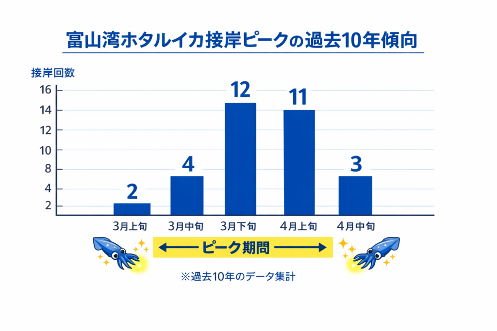 実際に、富山湾の海水温は3月中旬から下旬にかけて急激に上昇することが多く、ホタルイカの接岸数もそれに連動する傾向があります。