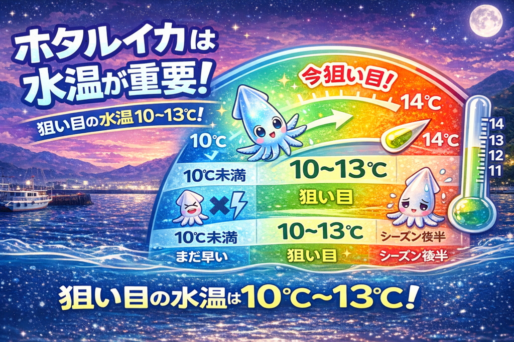 ホタルイカは、水温10〜13℃のときに最も接岸しやすくなります。