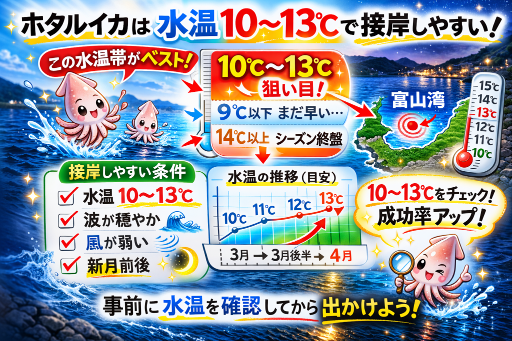 結論から言うと、ホタルイカは水温が10〜13℃のときに接岸しやすいです。